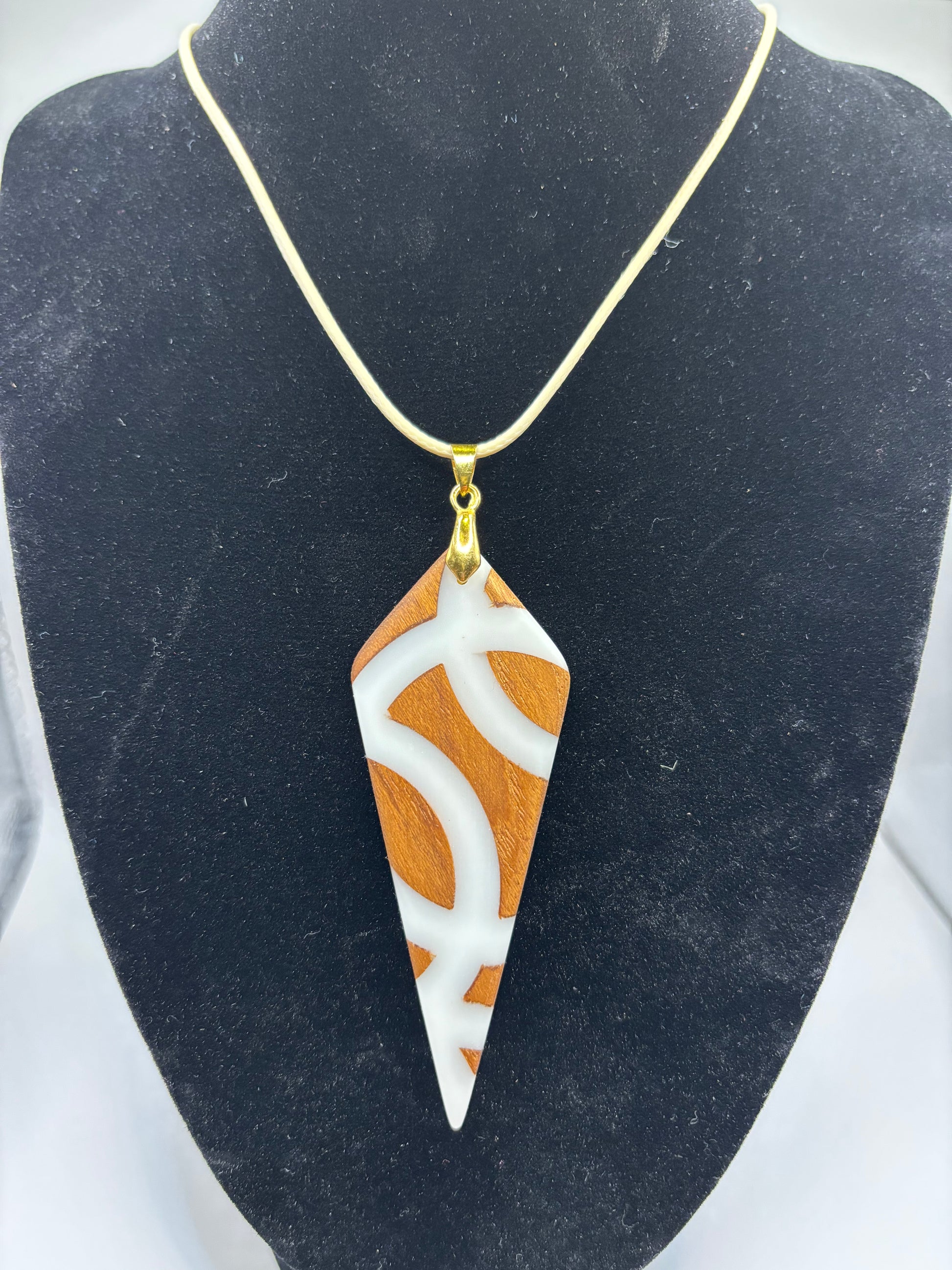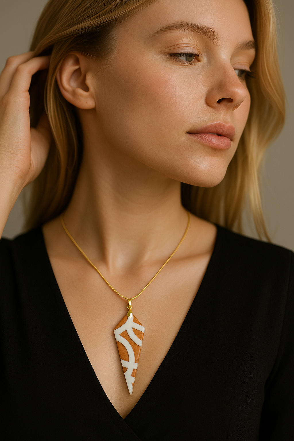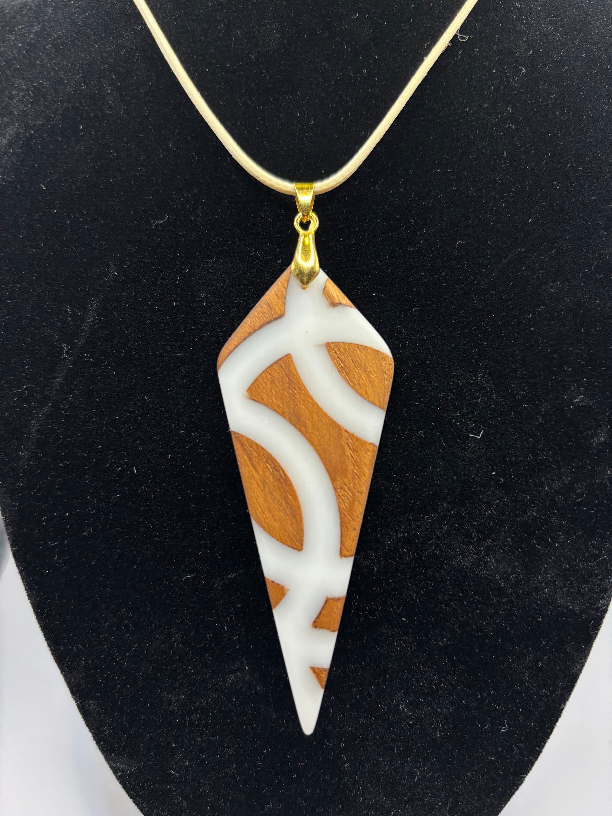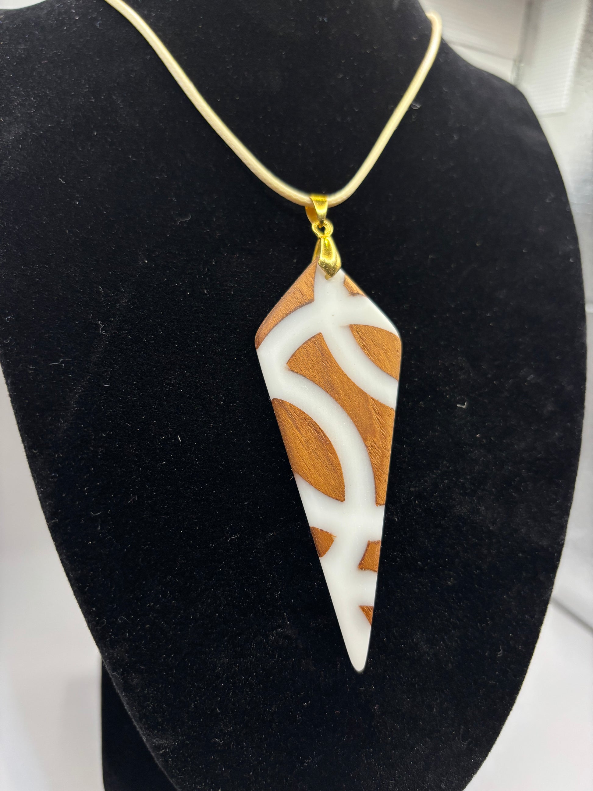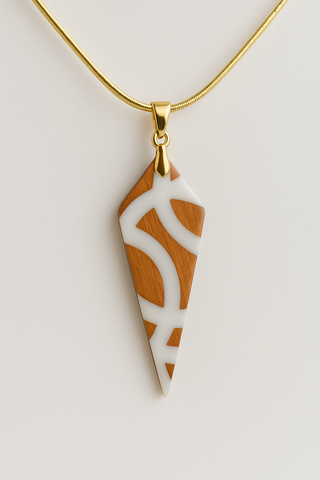 Ce pendentif unique associe la chaleur du bois naturel et la pureté de l’époxy blanc. Ses lignes organiques rappellent l’équilibre entre nature et modernité, pour un bijou élégant et intemporel.
