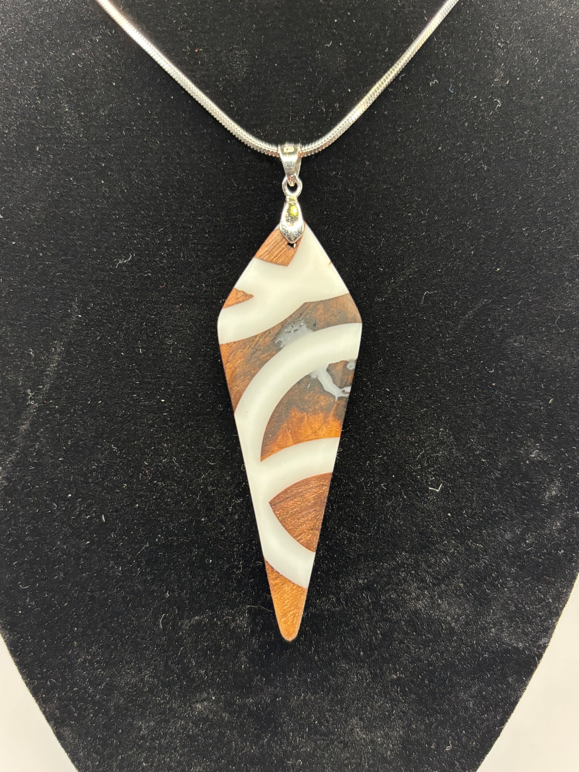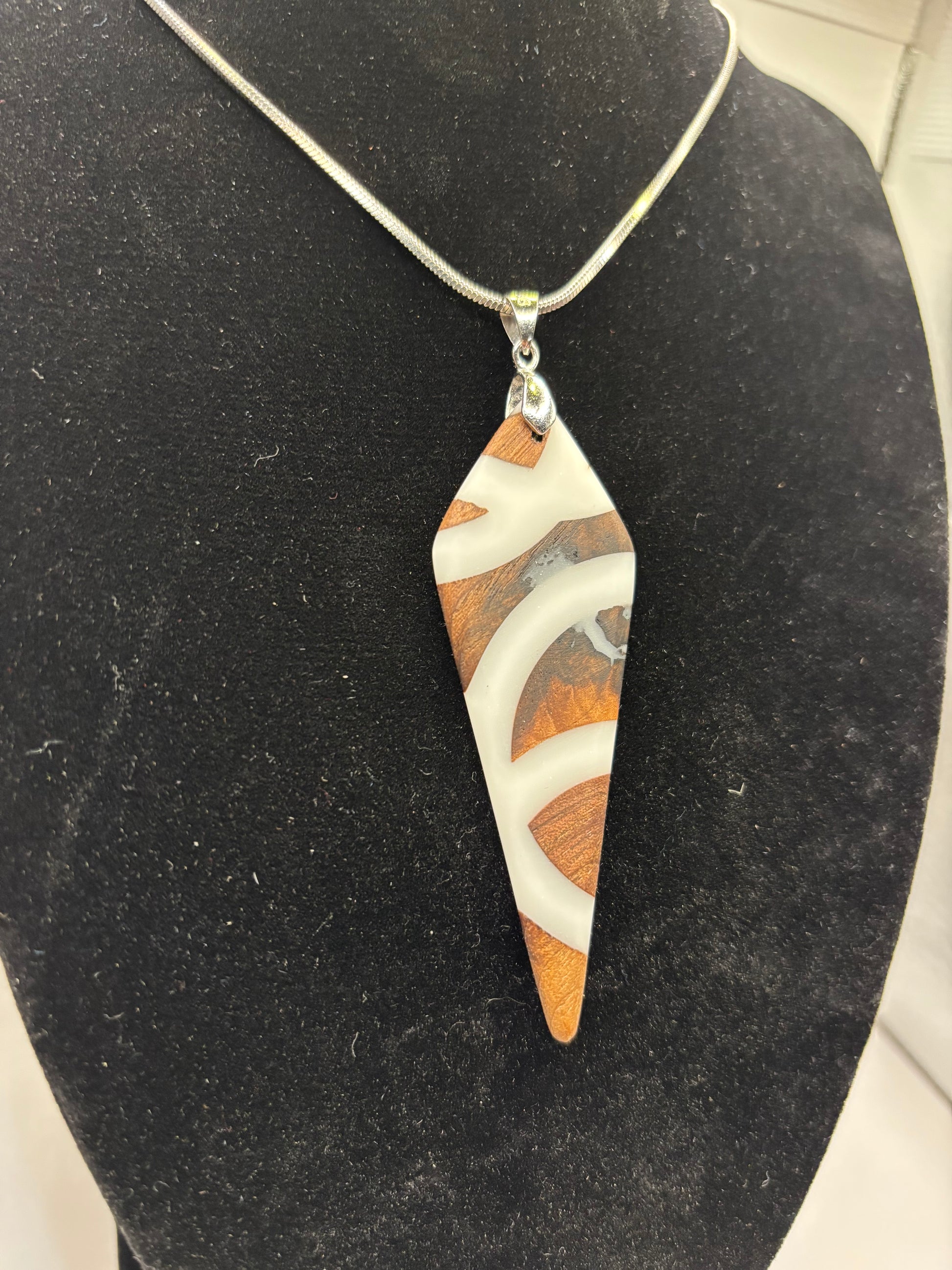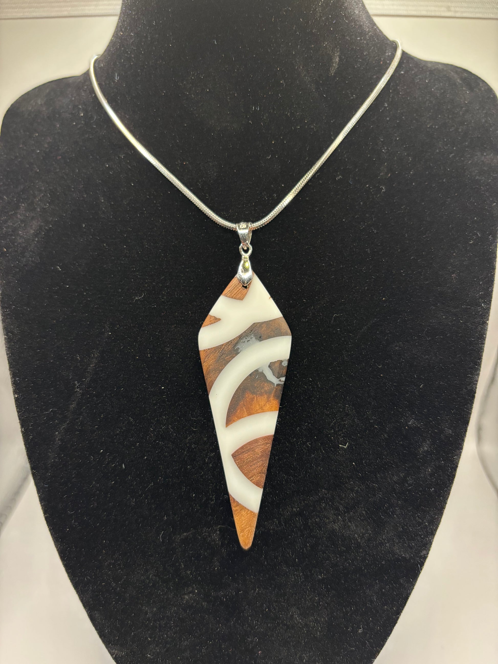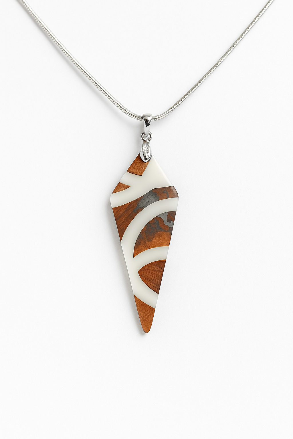 Ce pendentif unique associe la chaleur du bois naturel et la pureté de l’époxy blanc. Ses lignes organiques rappellent l’équilibre entre nature et modernité, pour un bijou élégant et intemporel.