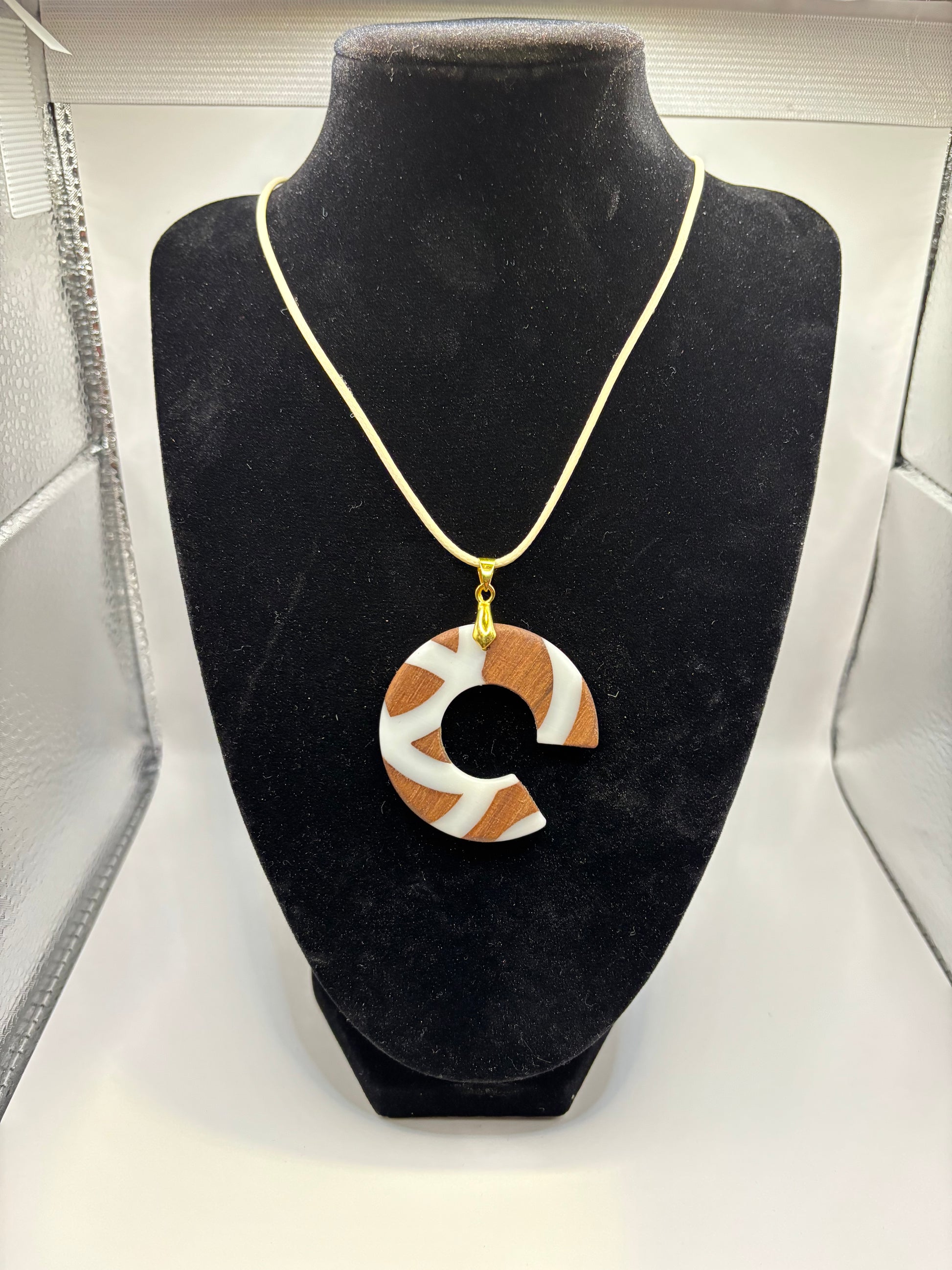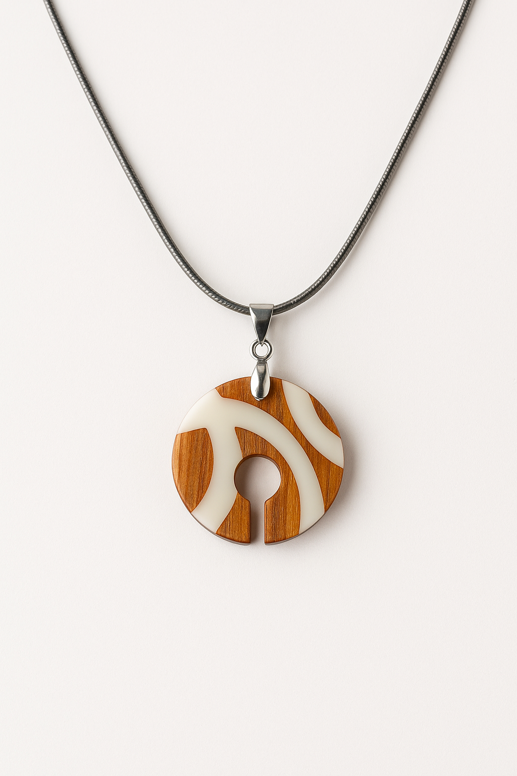 Ce pendentif unique associe la chaleur du bois naturel et la pureté de l’époxy blanc. Ses lignes organiques rappellent l’équilibre entre nature et modernité, pour un bijou élégant et intemporel.