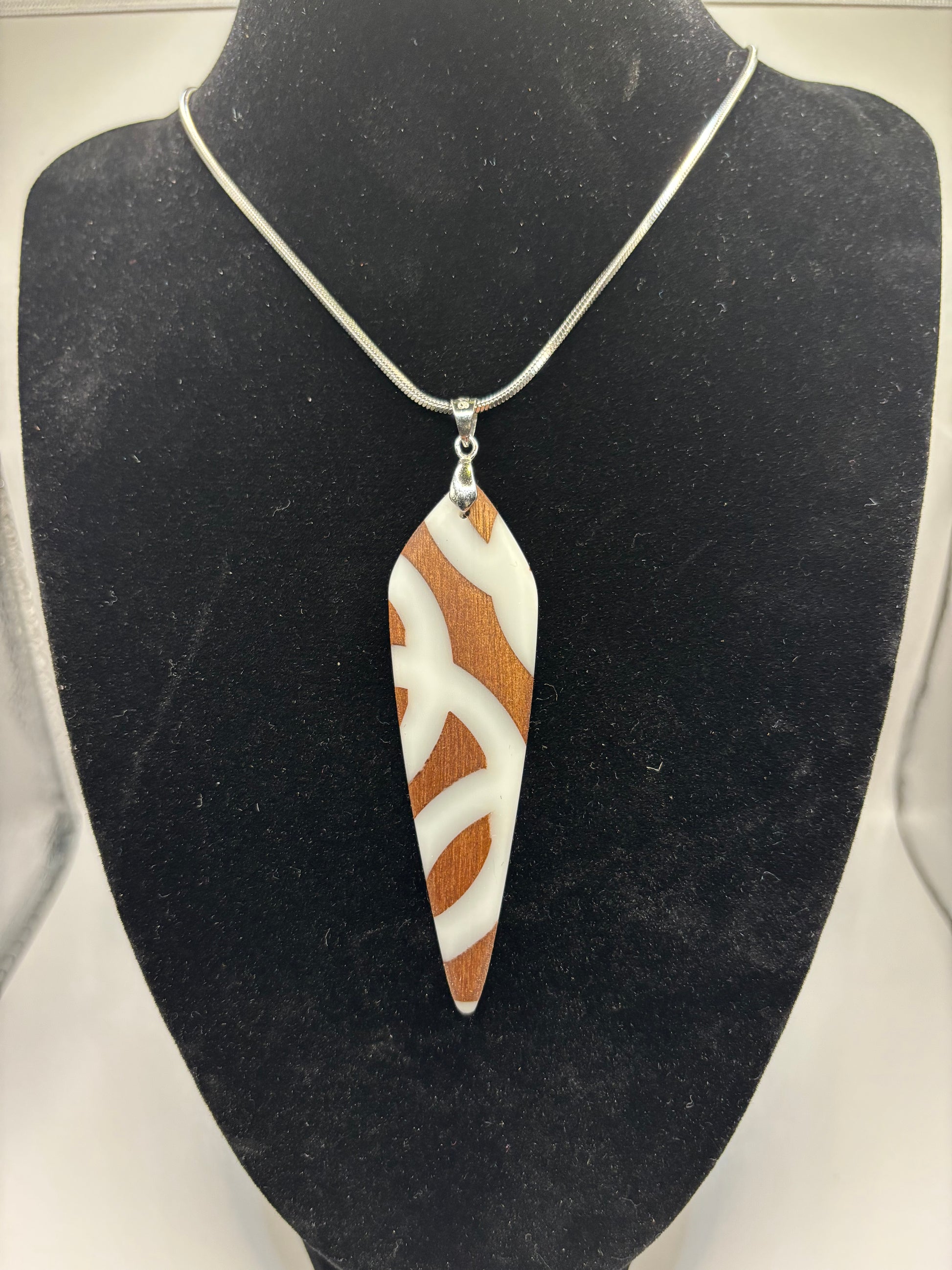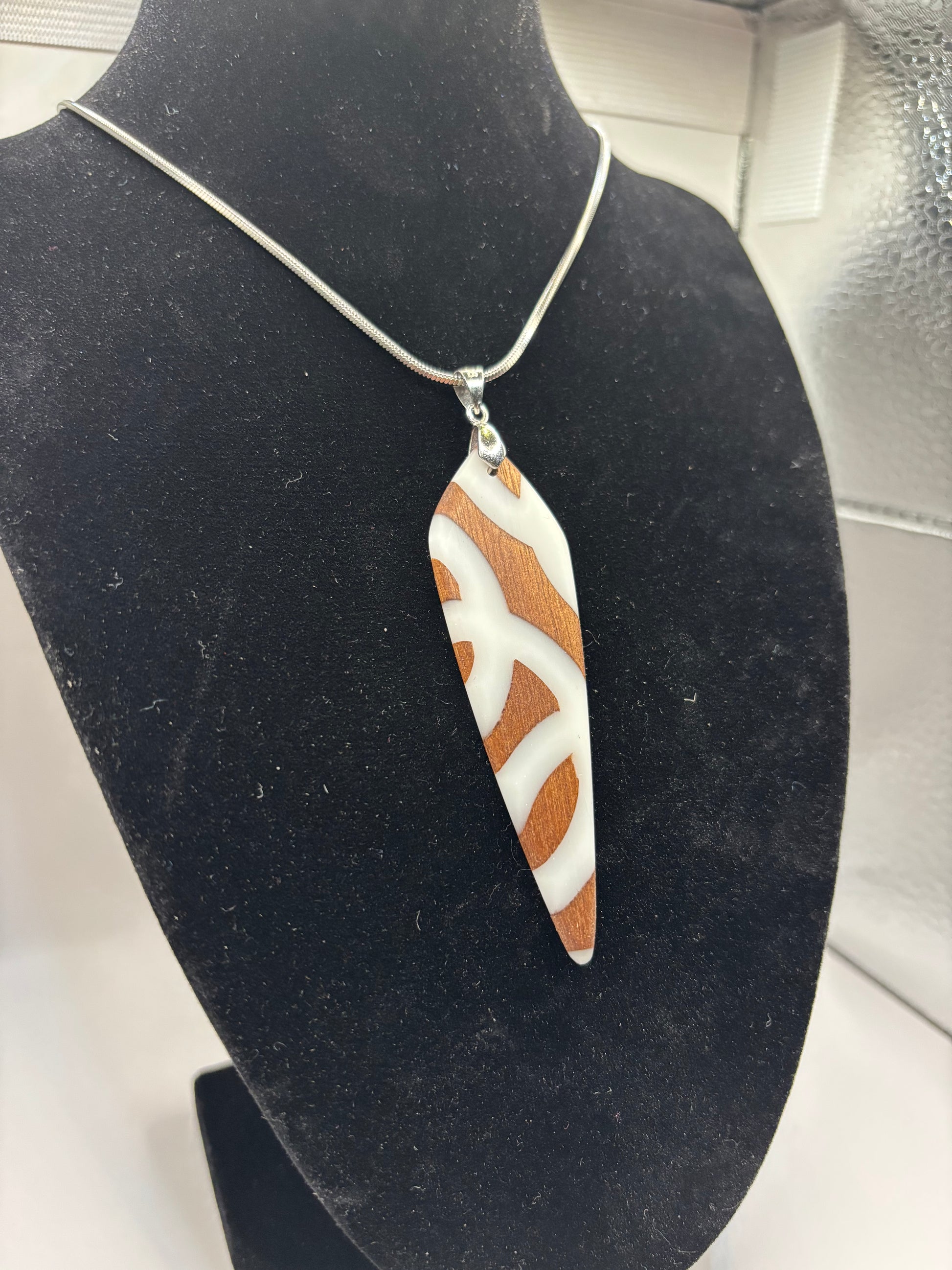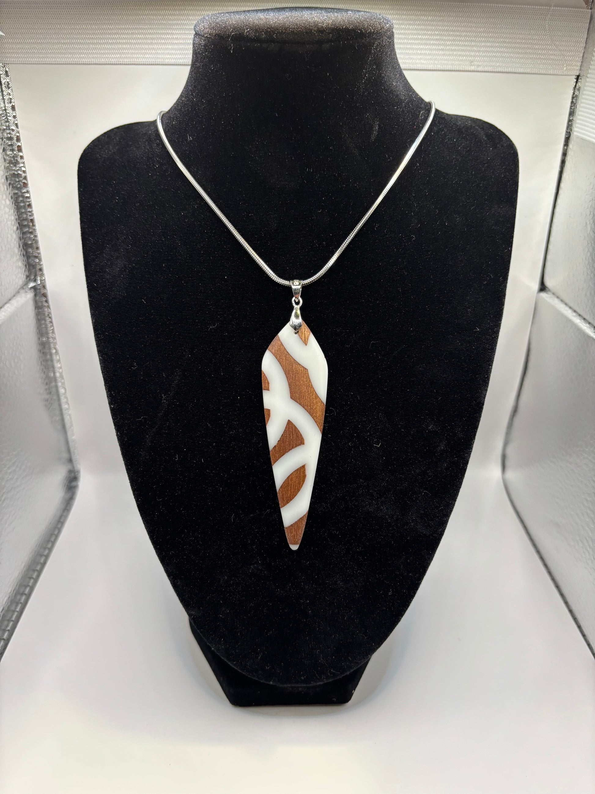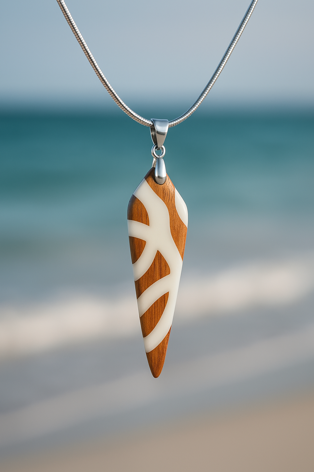 Ce pendentif unique associe la chaleur du bois naturel et la pureté de l’époxy blanc. Ses lignes organiques rappellent l’équilibre entre nature et modernité, pour un bijou élégant et intemporel.