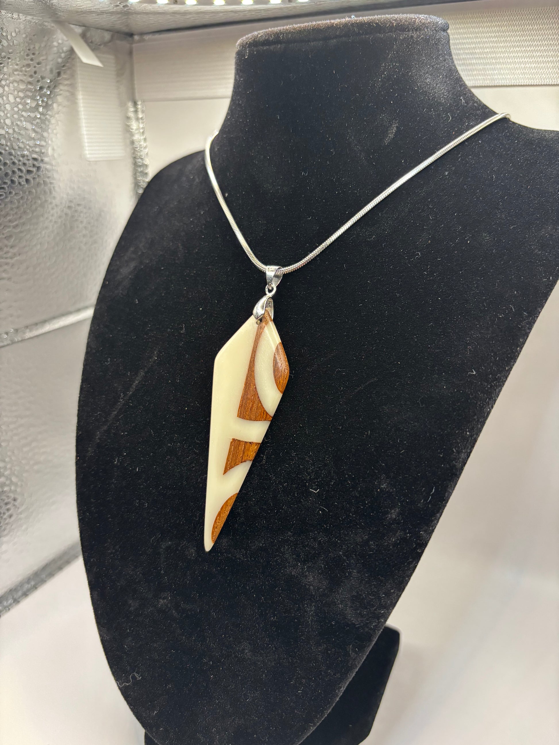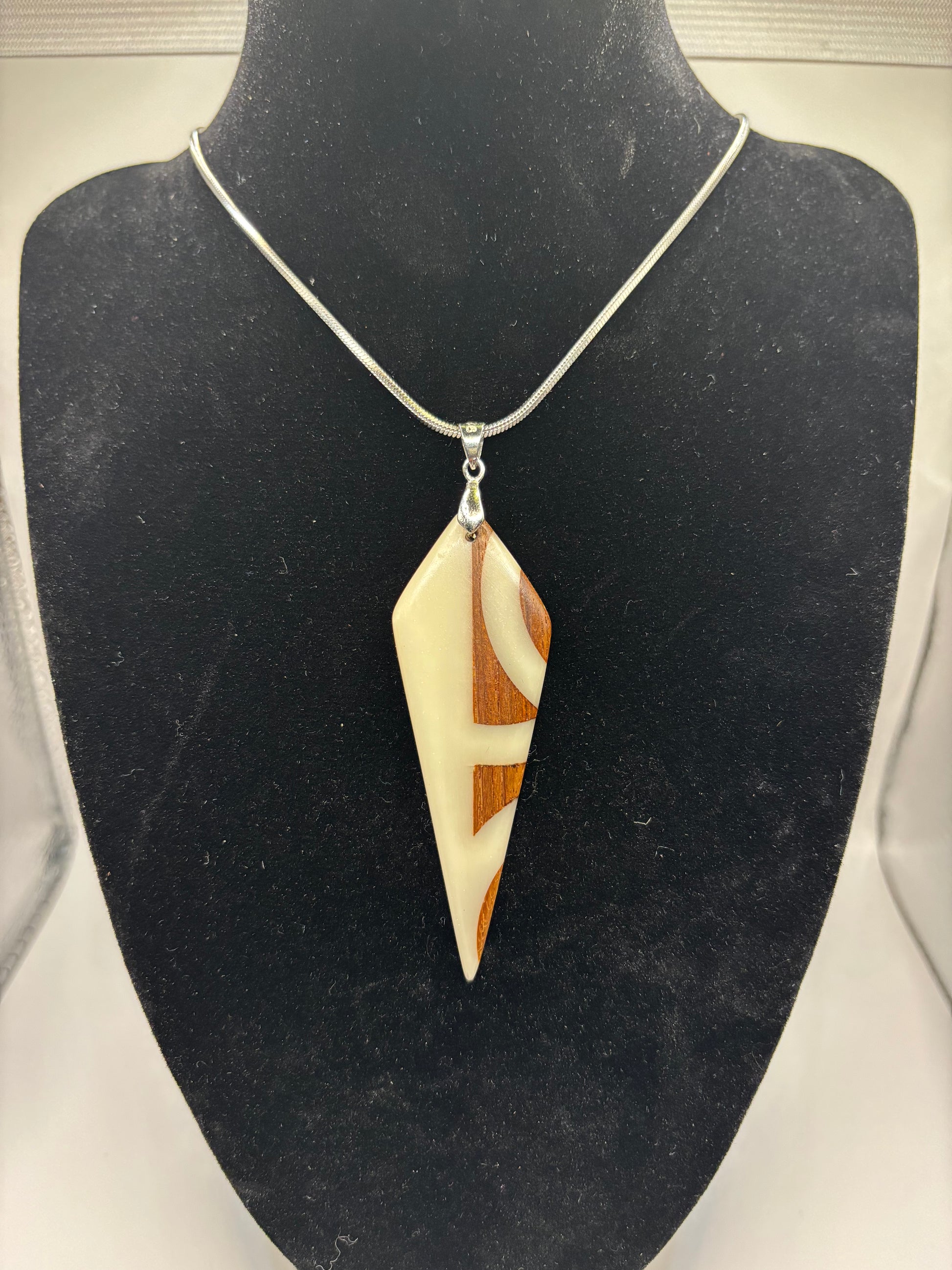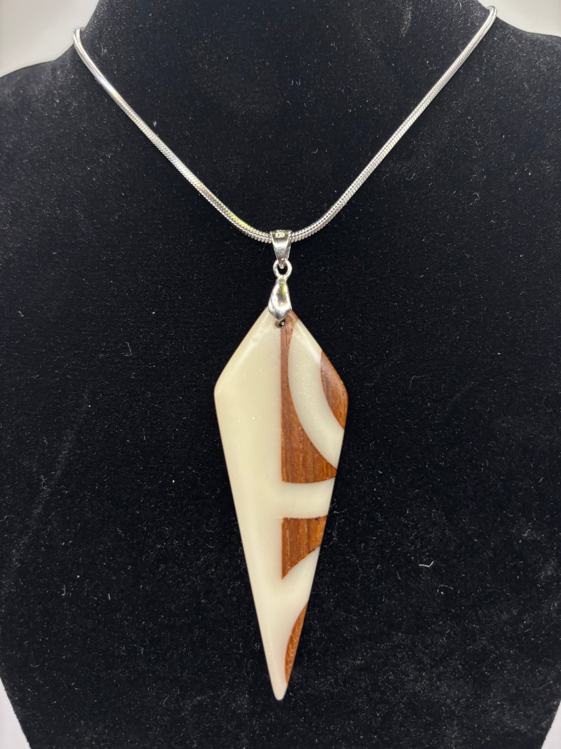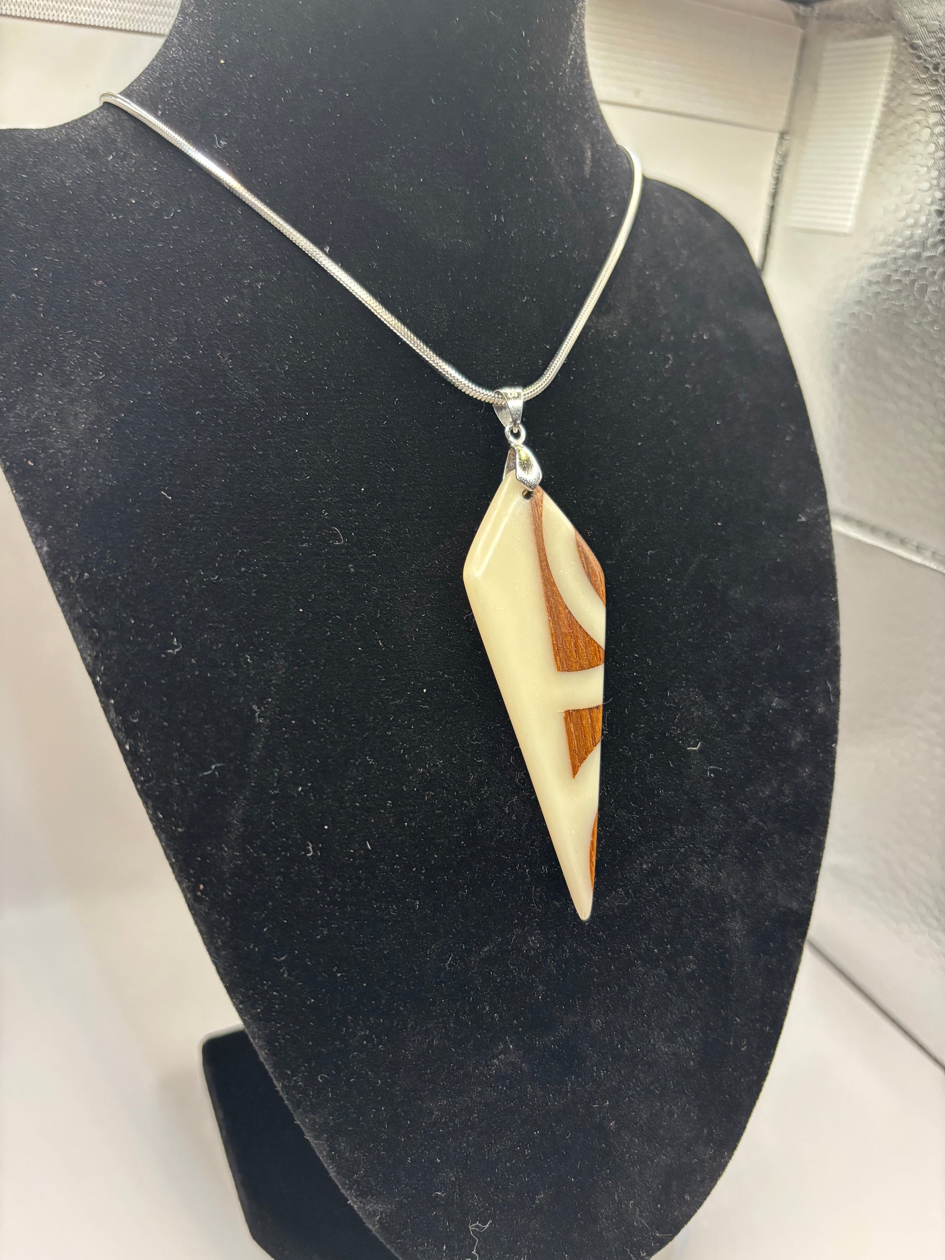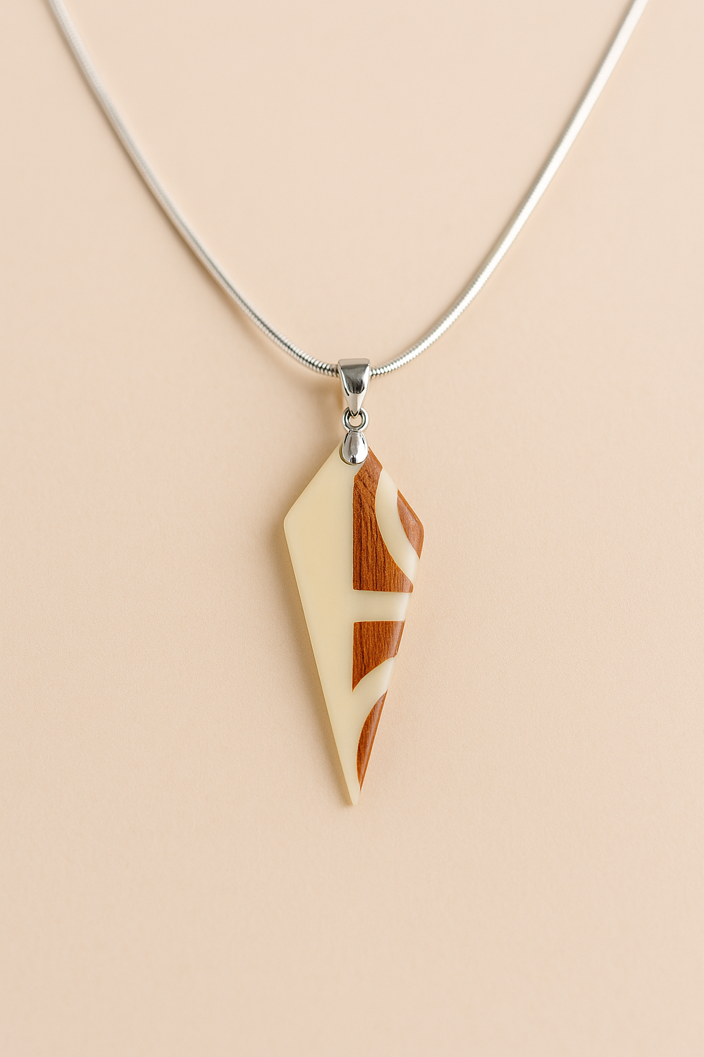 Ce pendentif unique associe la chaleur du bois naturel et la pureté de l’époxy blanc. Ses lignes organiques rappellent l’équilibre entre nature et modernité, pour un bijou élégant et intemporel.