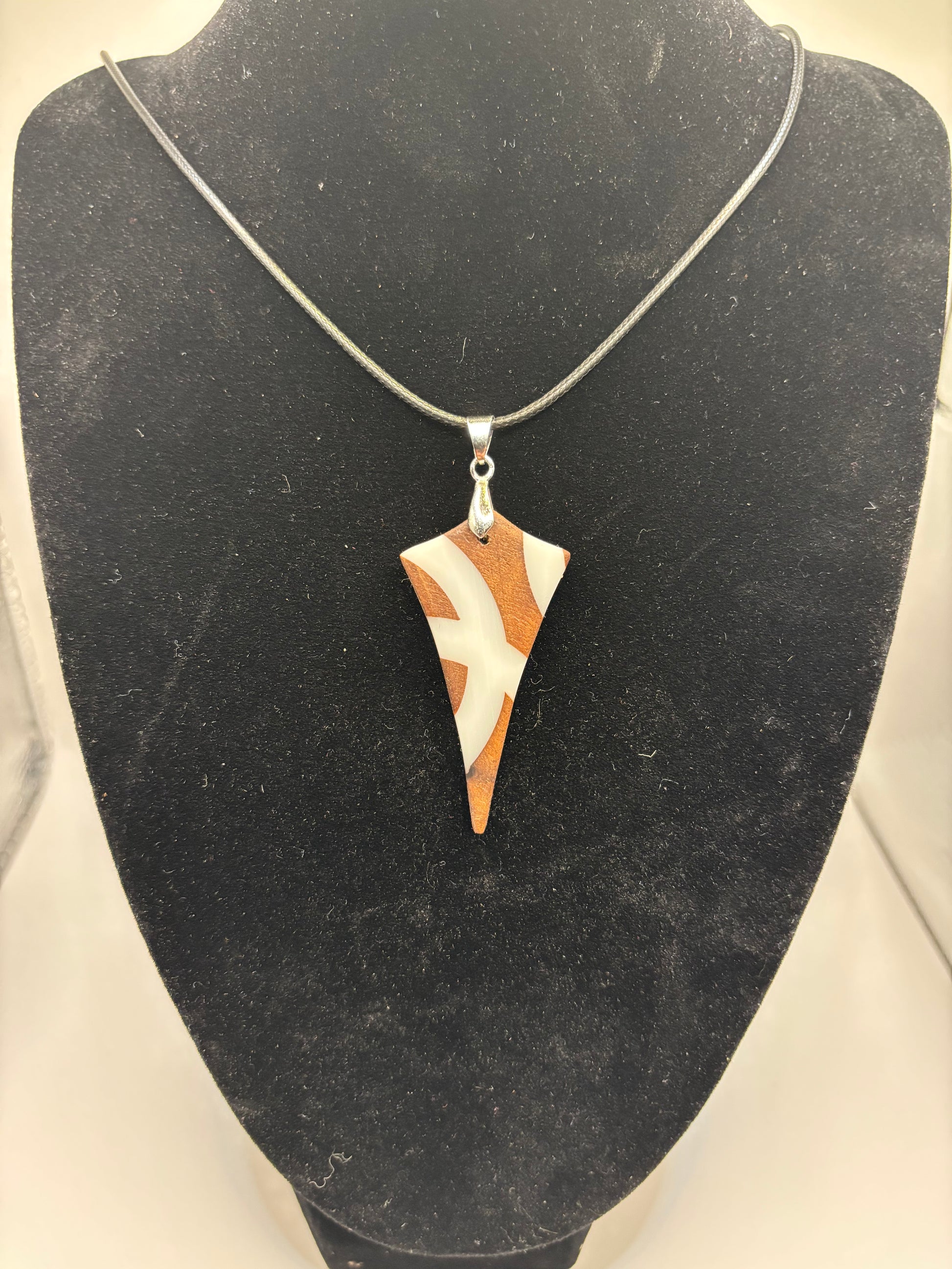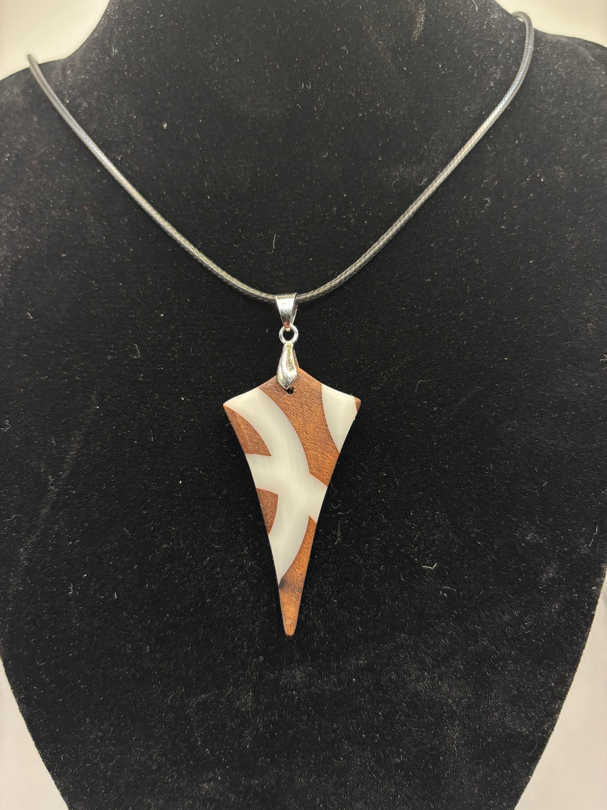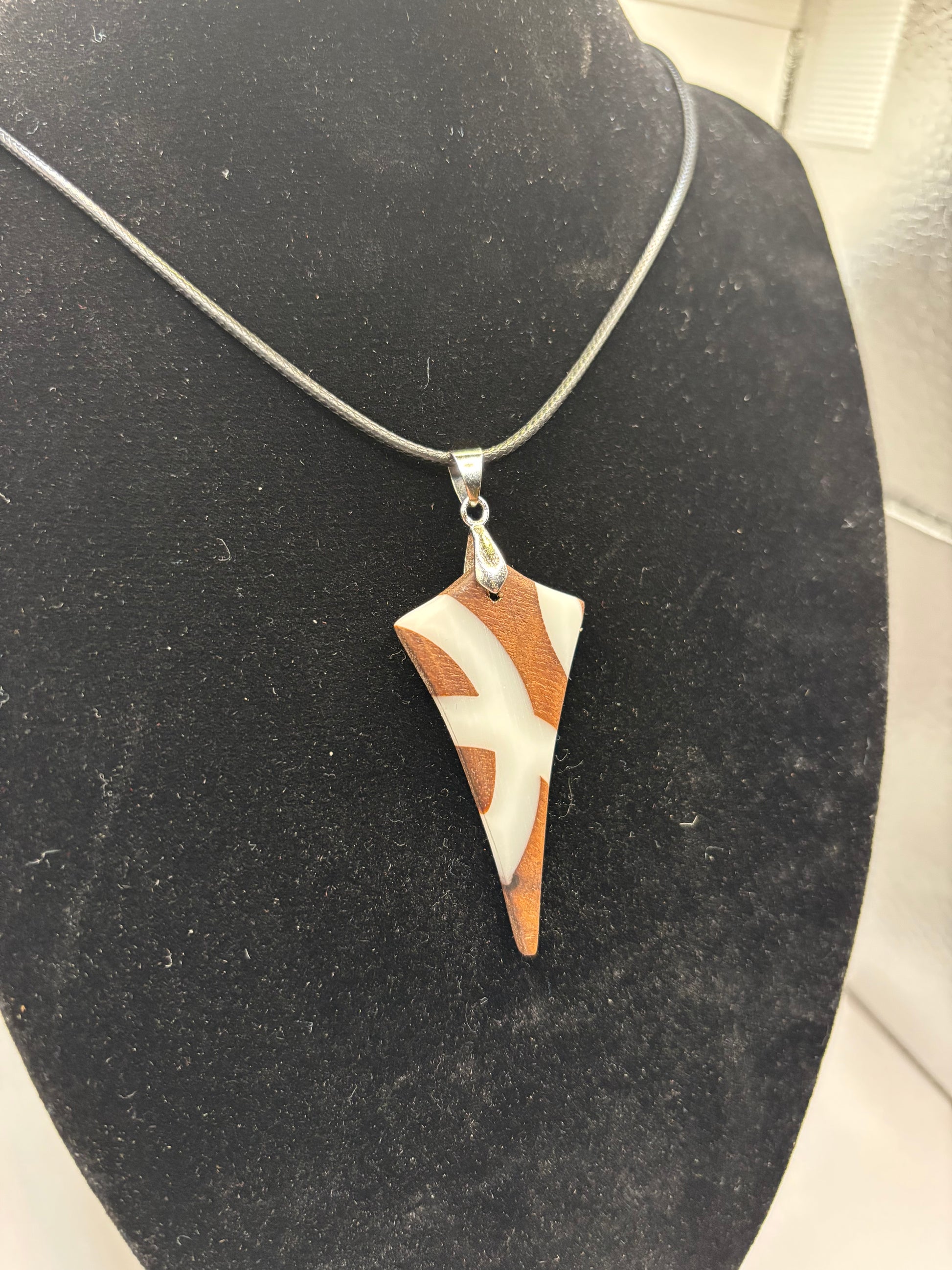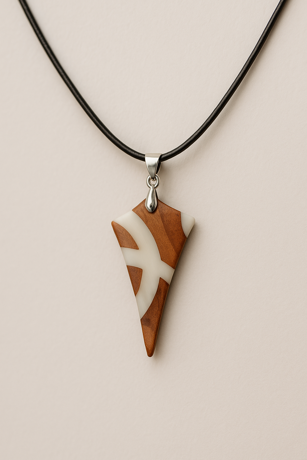 Ce pendentif unique associe la chaleur du bois naturel et la pureté de l’époxy blanc. Ses lignes organiques rappellent l’équilibre entre nature et modernité, pour un bijou élégant et intemporel.