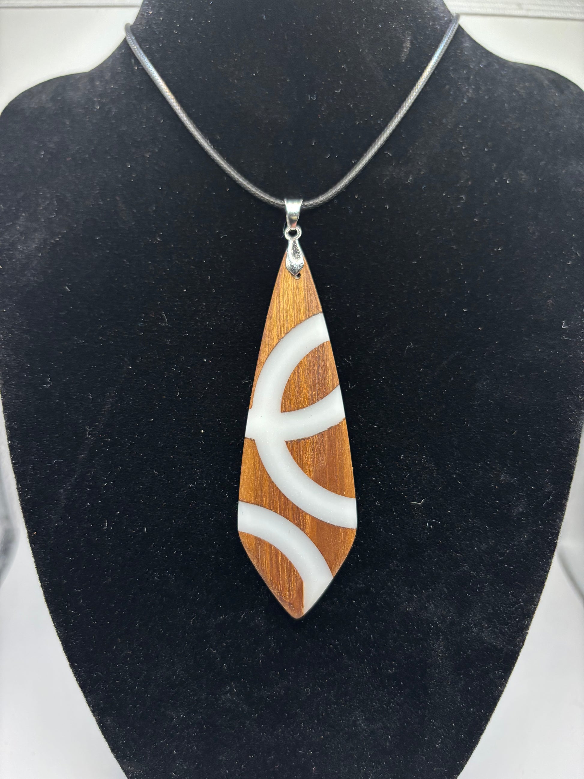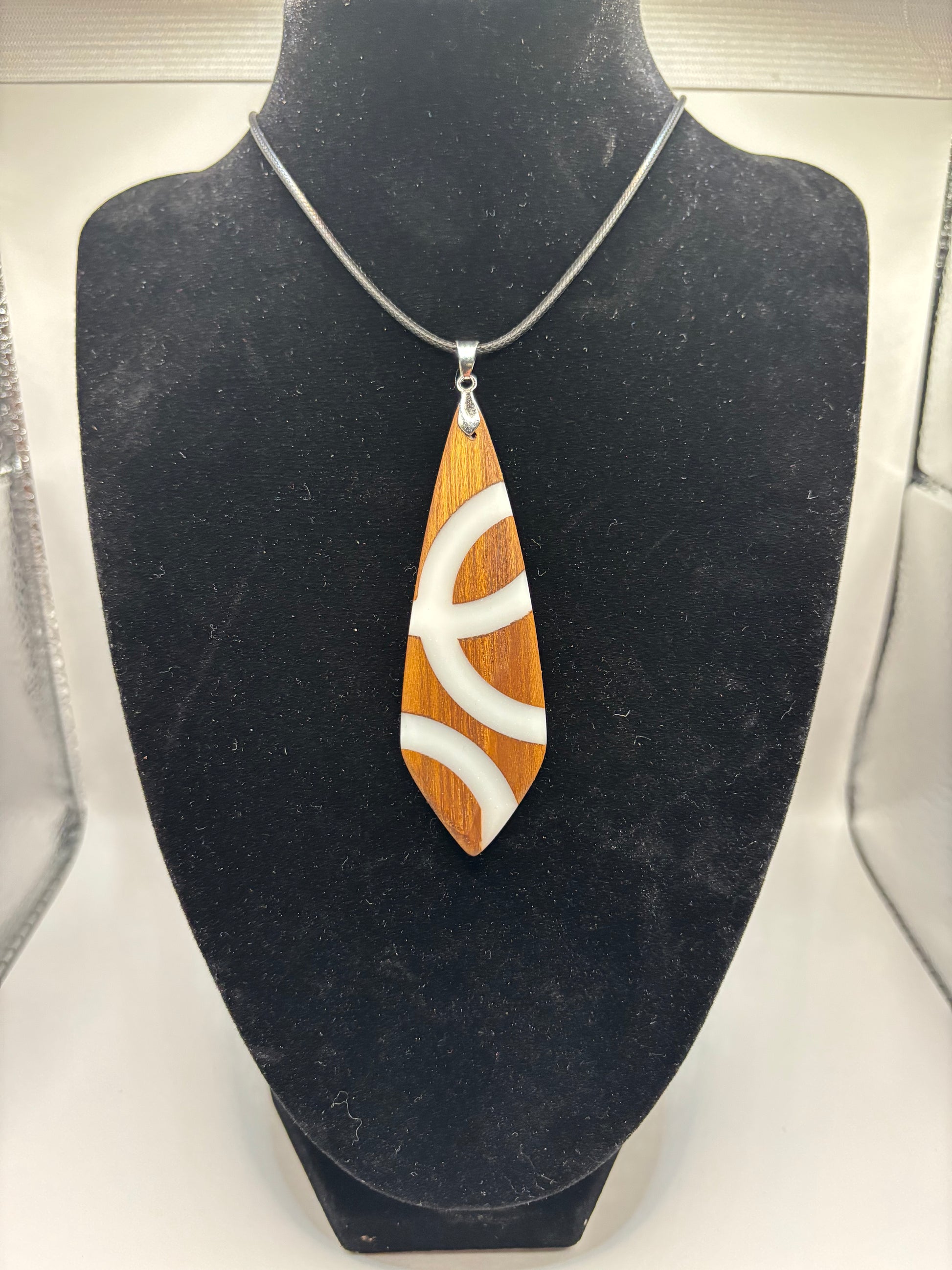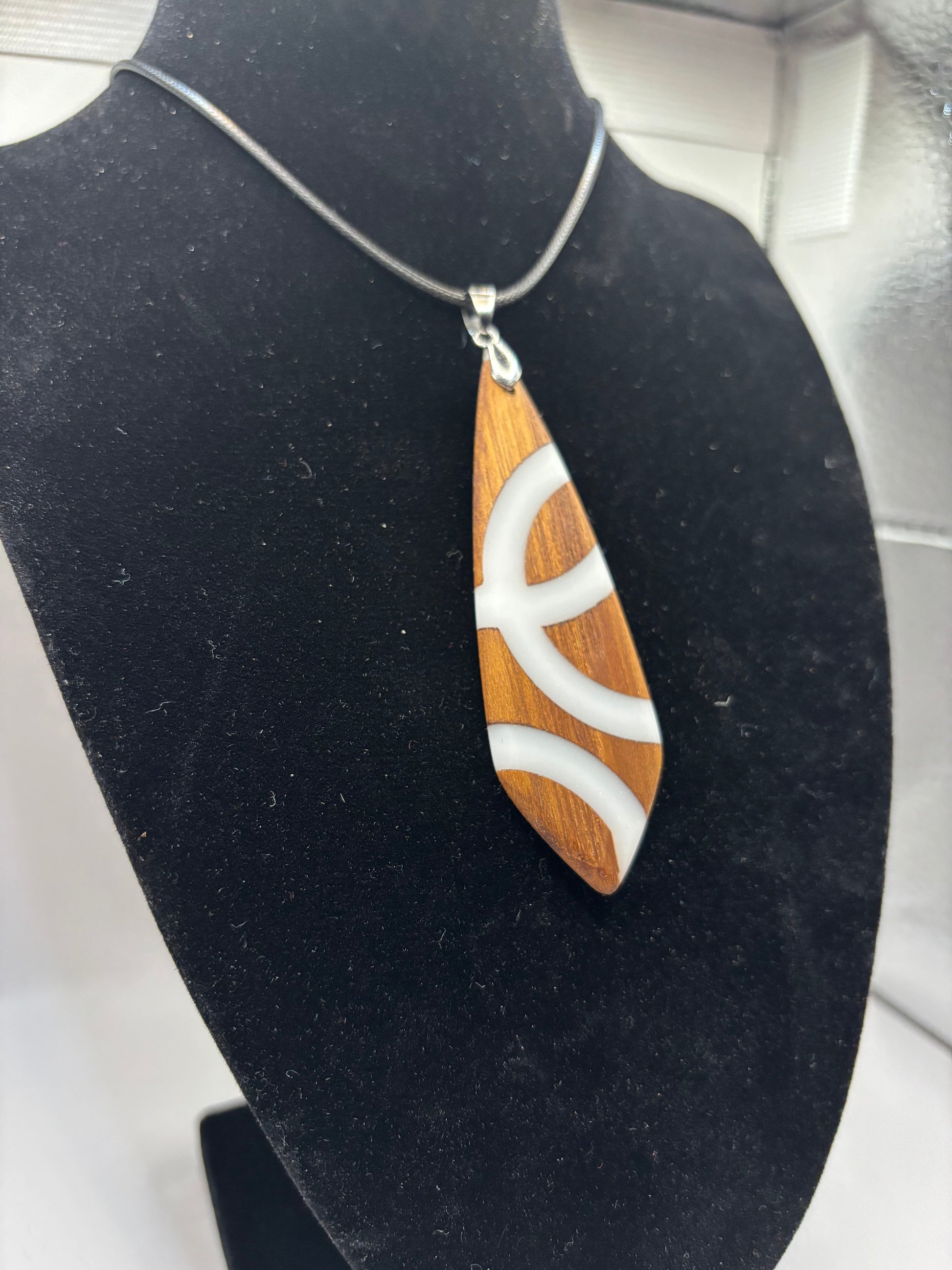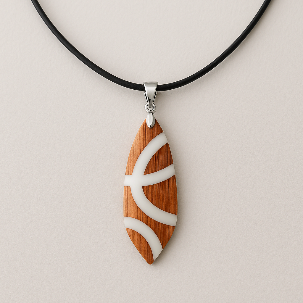 Ce pendentif unique associe la chaleur du bois naturel et la pureté de l’époxy blanc. Ses lignes organiques rappellent l’équilibre entre nature et modernité, pour un bijou élégant et intemporel.