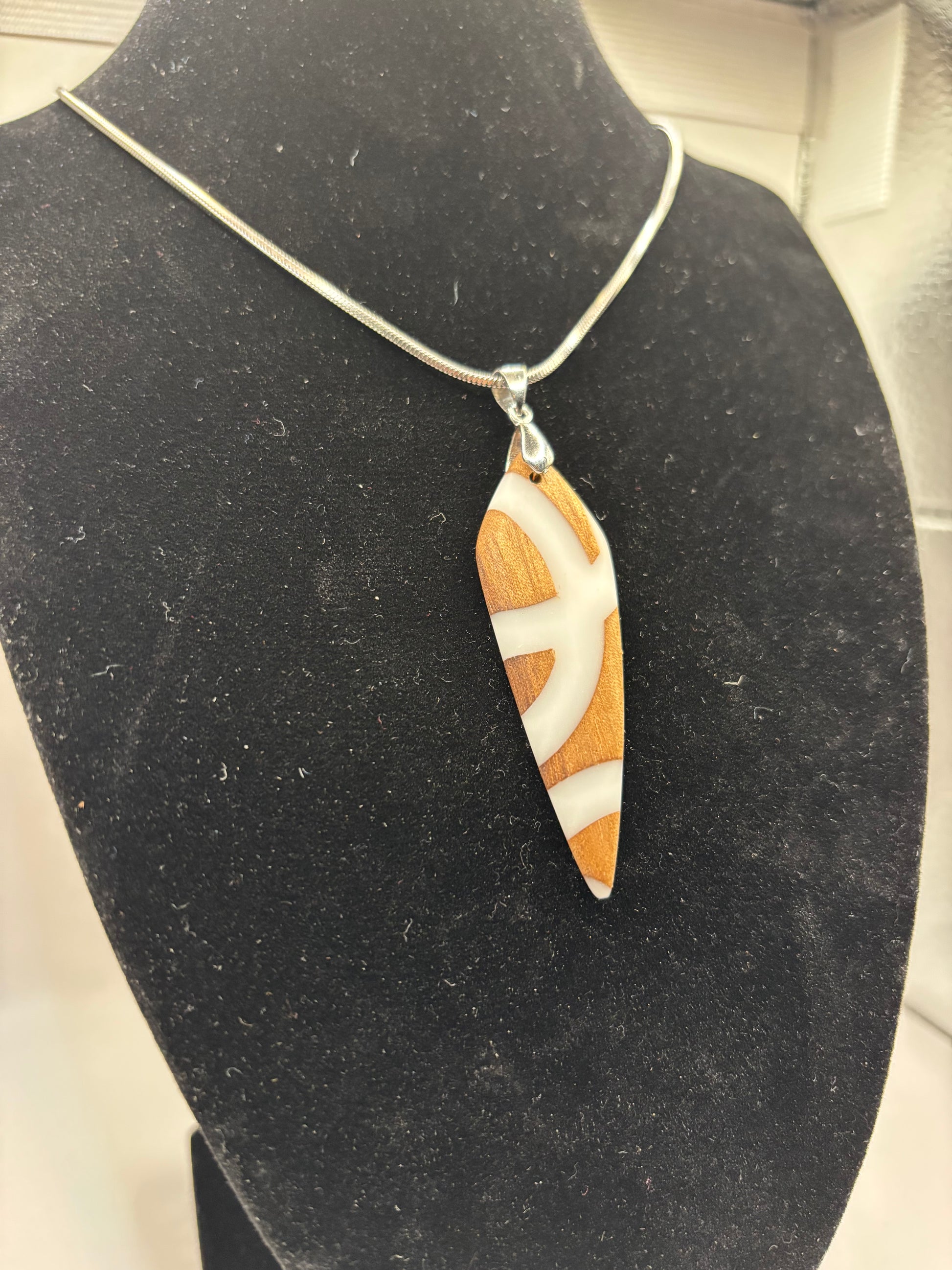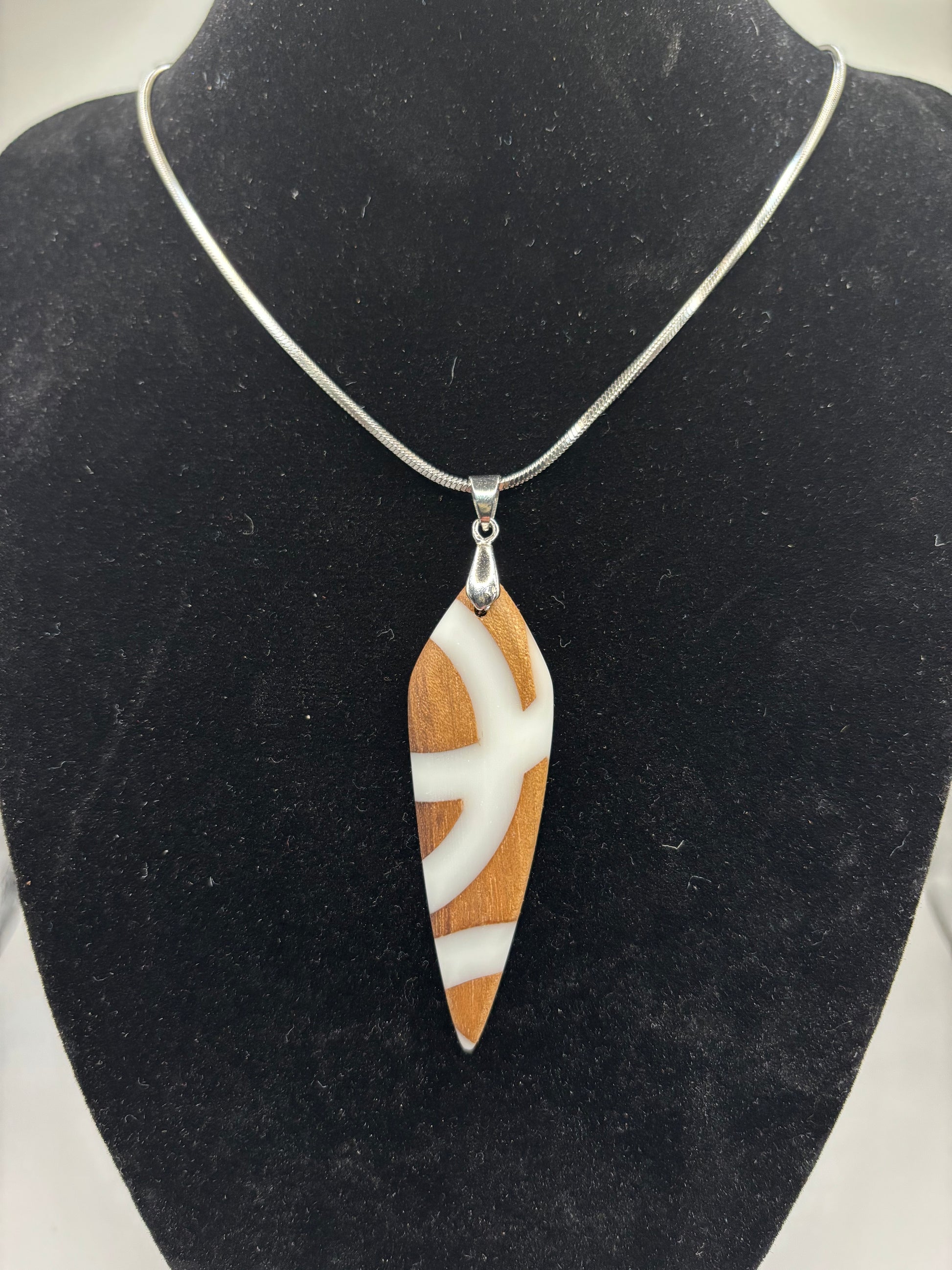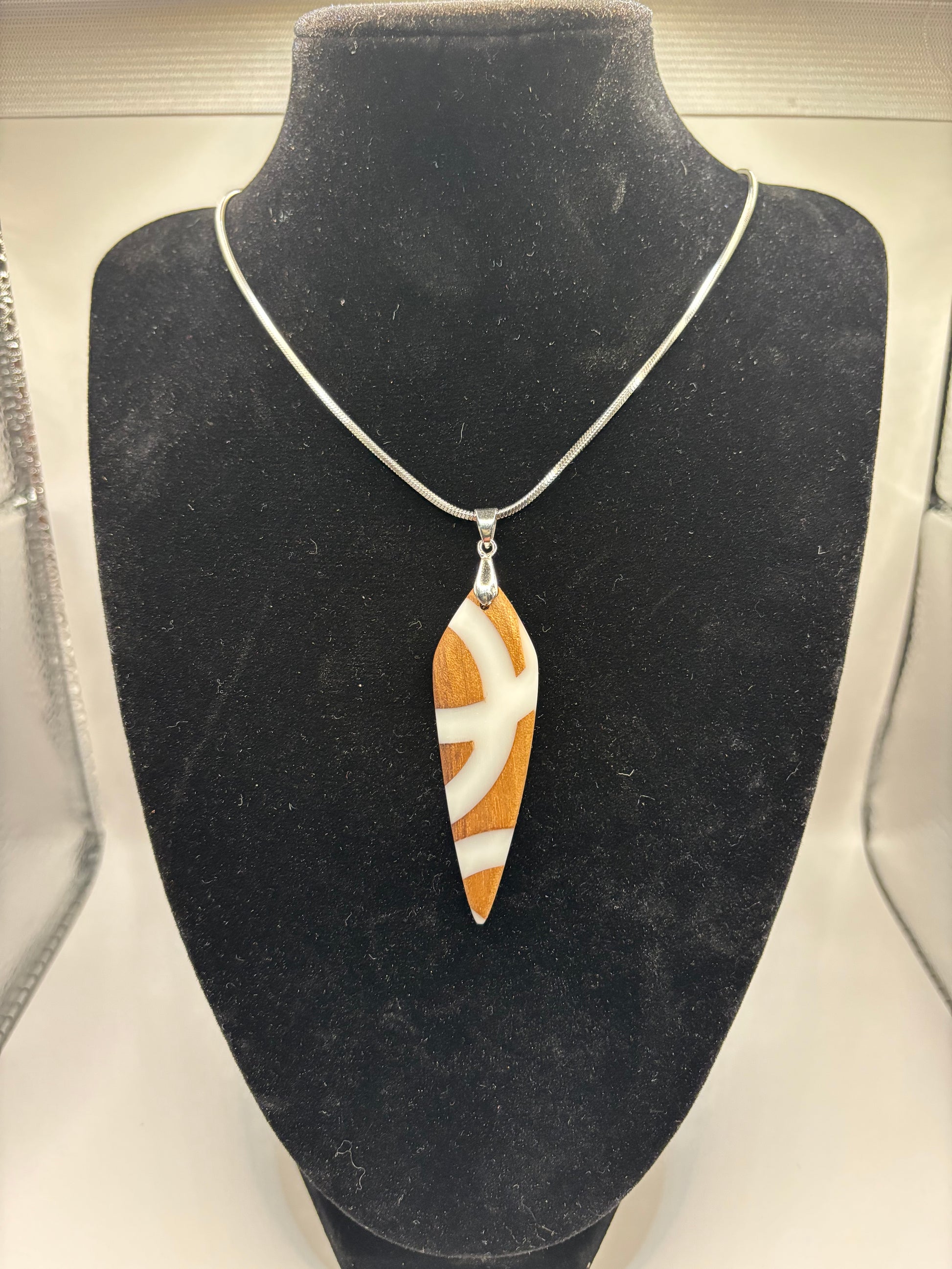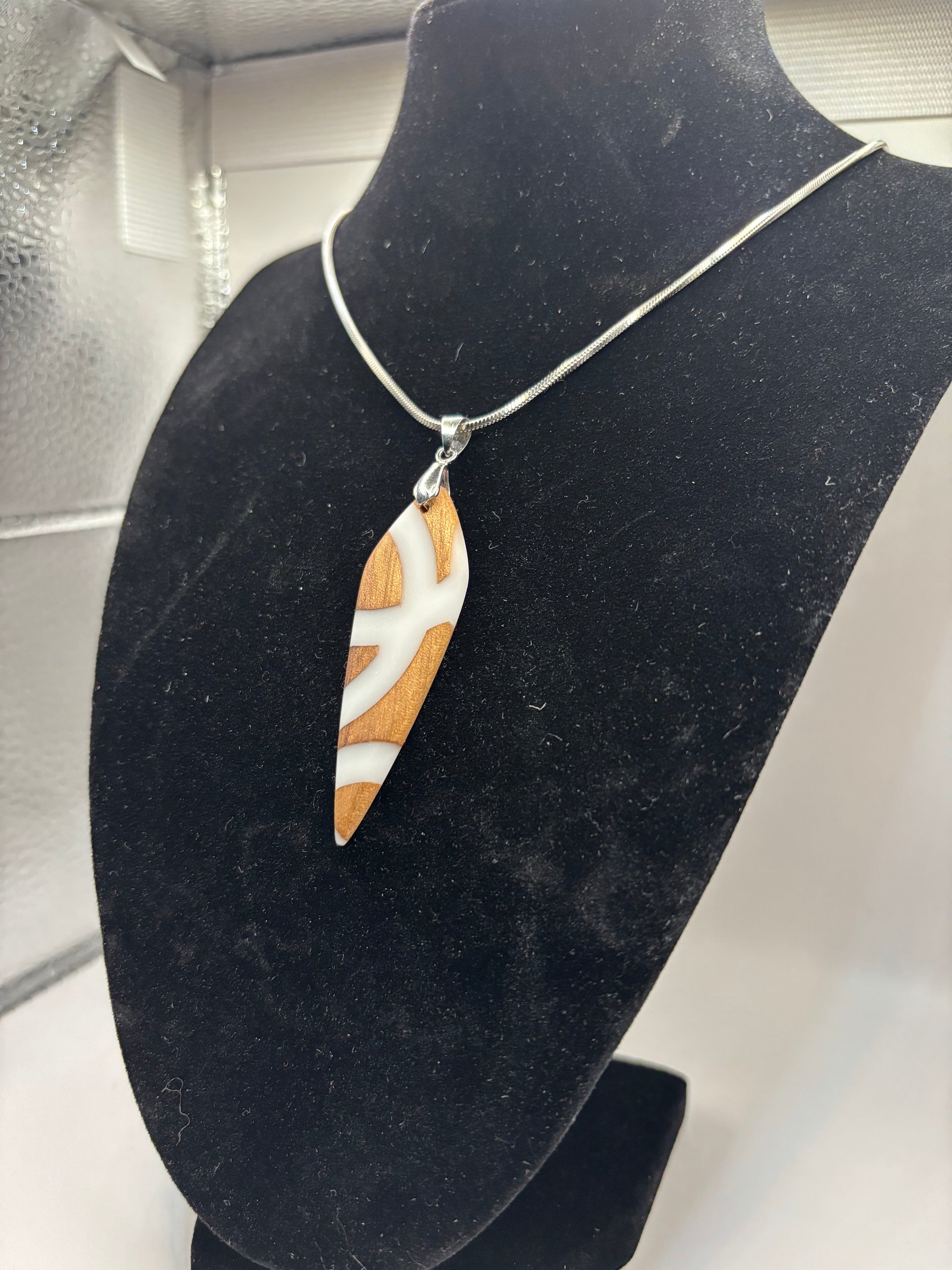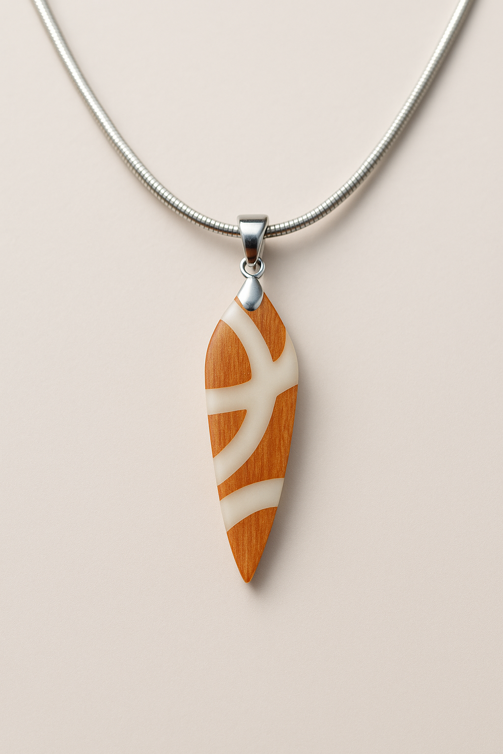 Ce pendentif unique associe la chaleur du bois naturel et la pureté de l’époxy blanc. Ses lignes organiques rappellent l’équilibre entre nature et modernité, pour un bijou élégant et intemporel.