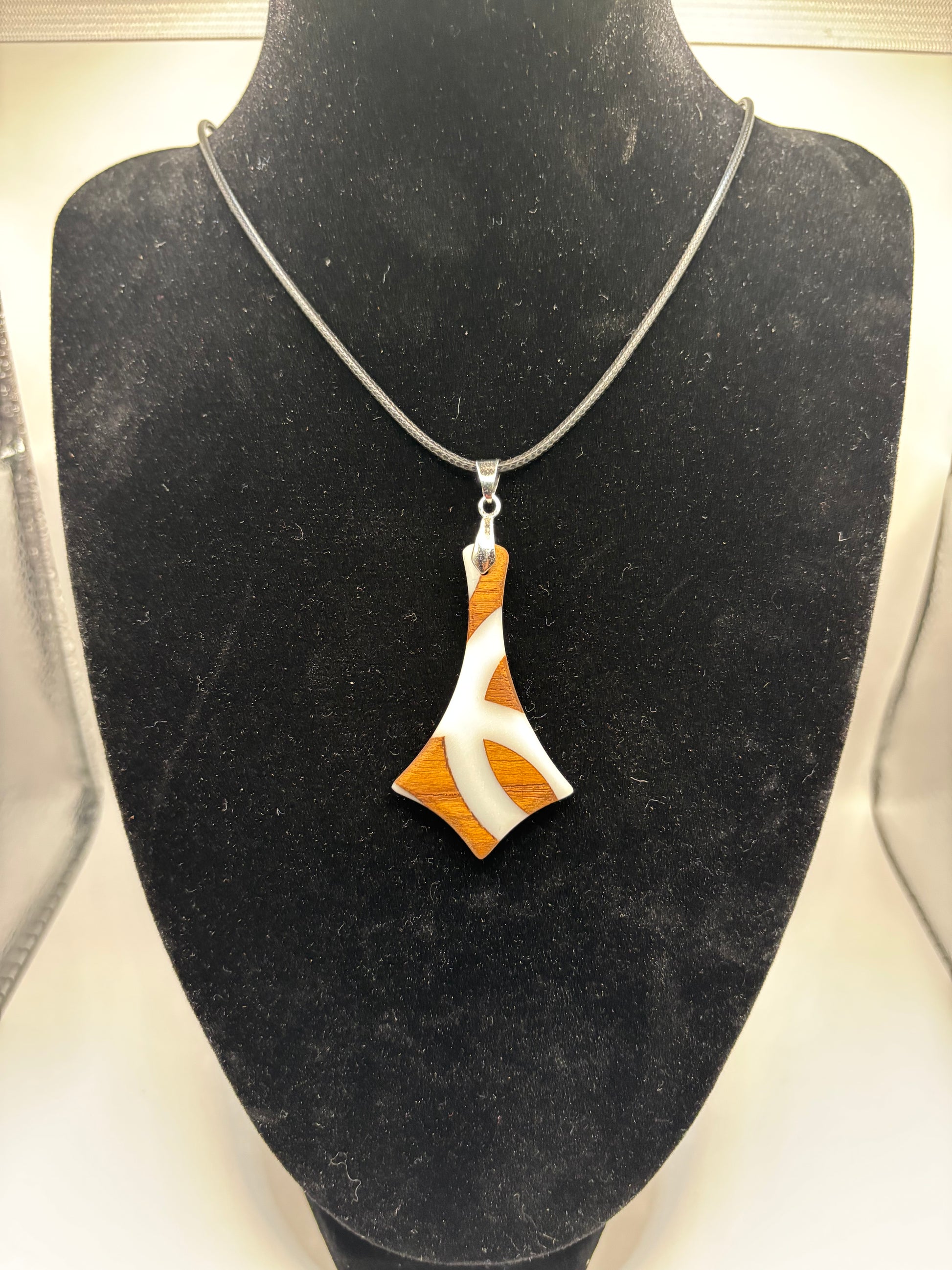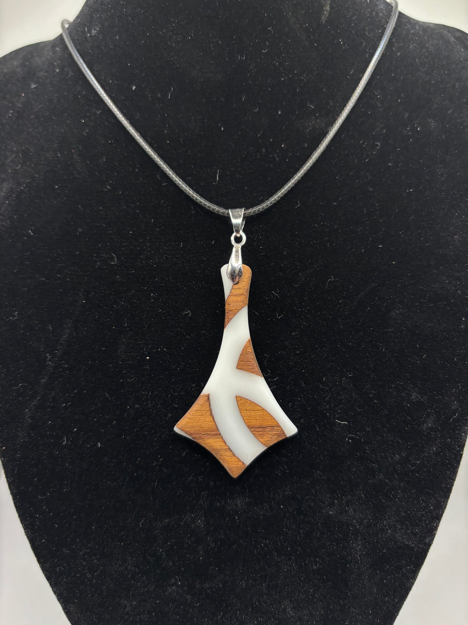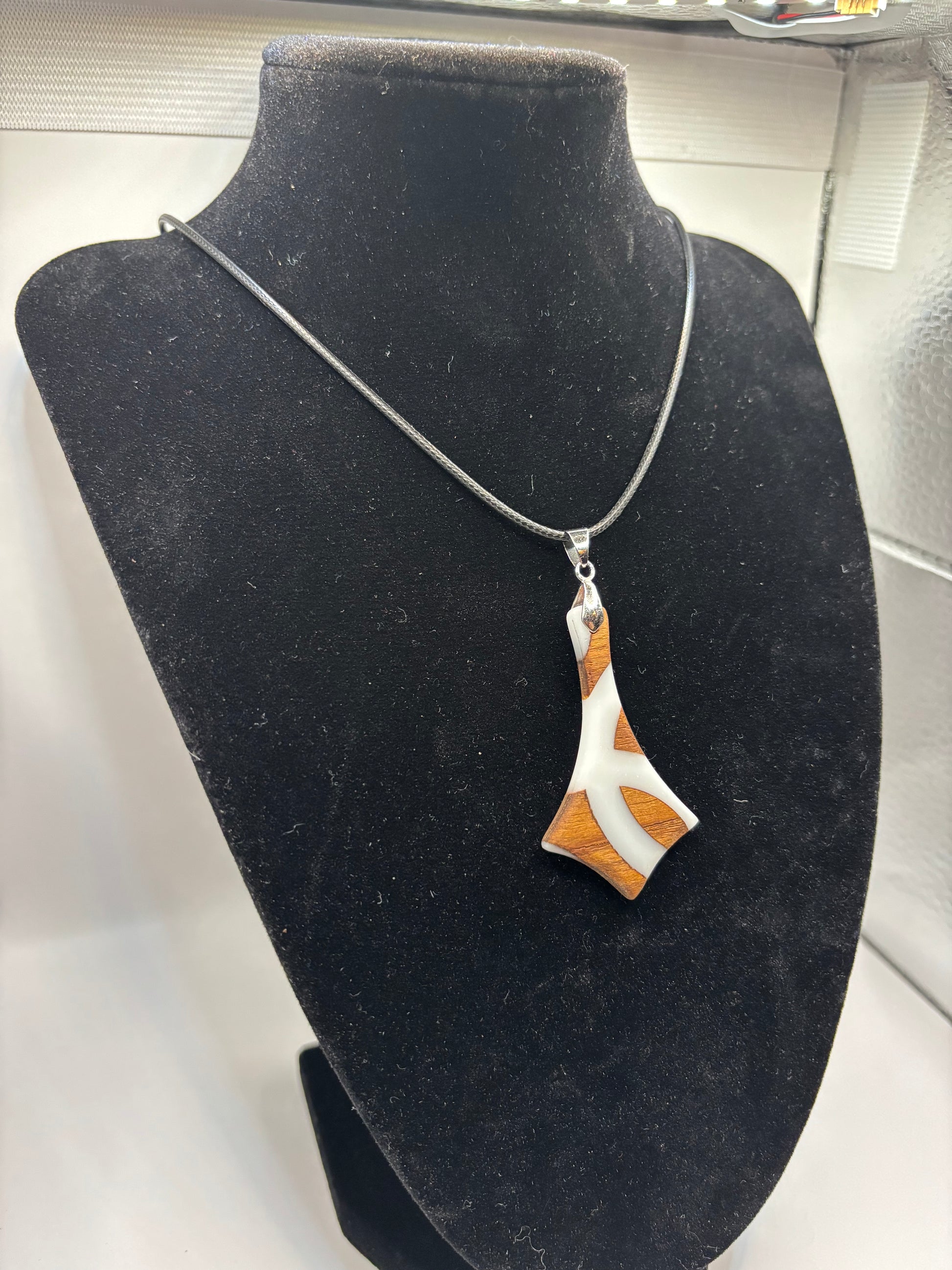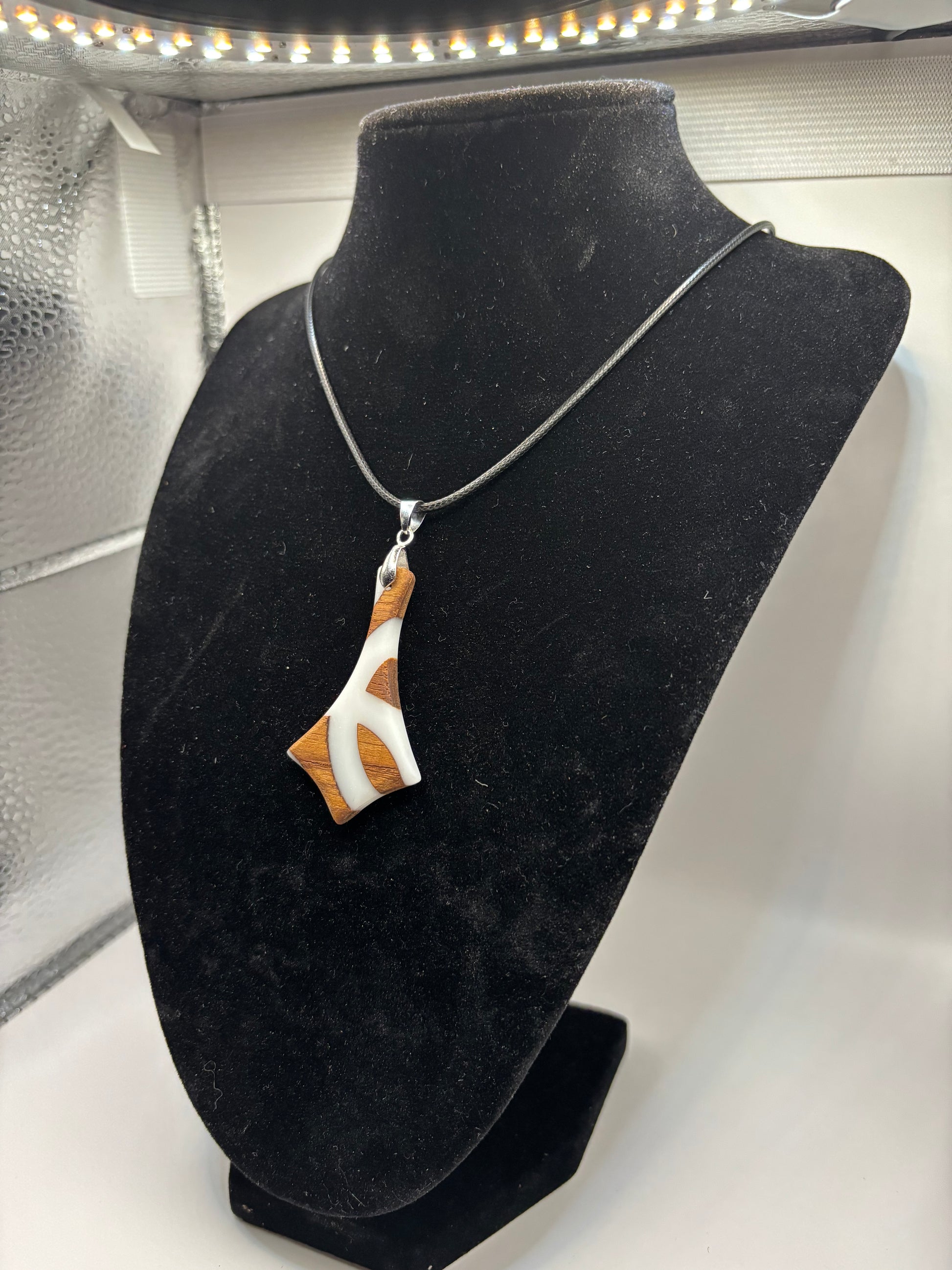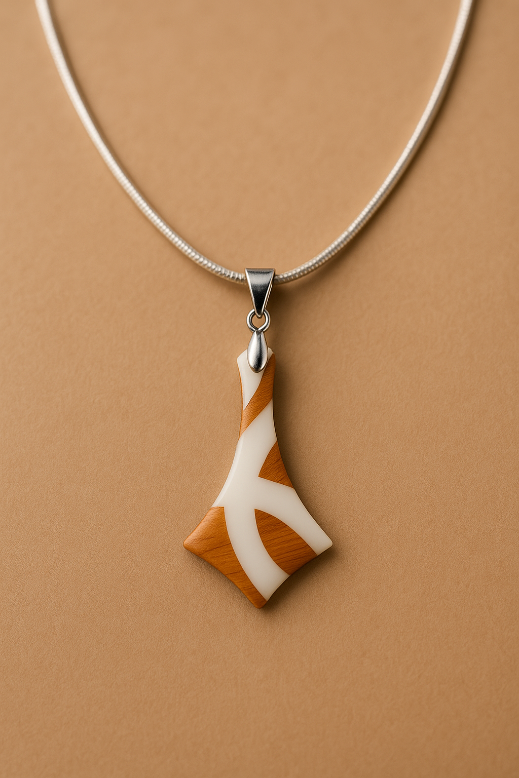 Ce pendentif unique associe la chaleur du bois naturel et la pureté de l’époxy blanc. Ses lignes organiques rappellent l’équilibre entre nature et modernité, pour un bijou élégant et intemporel.