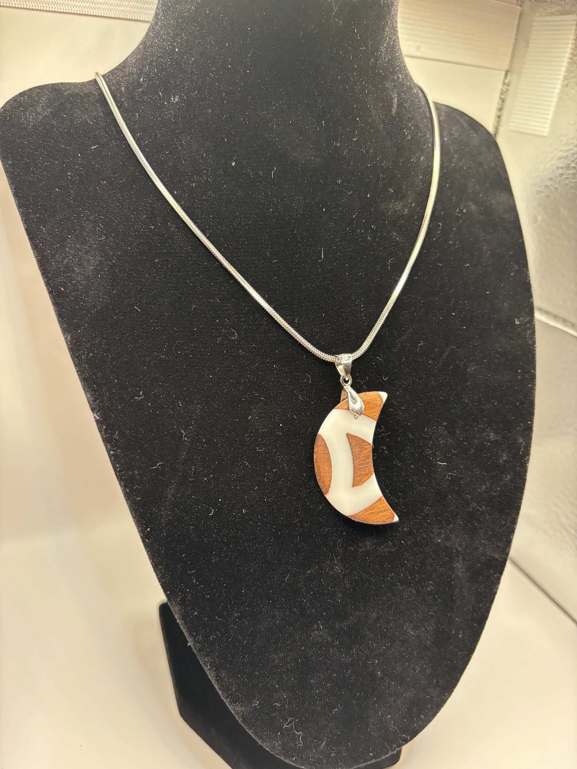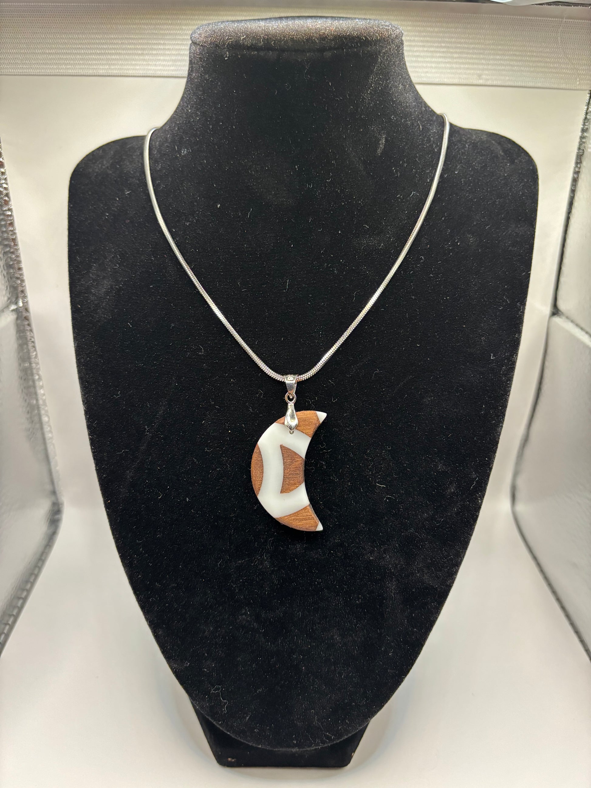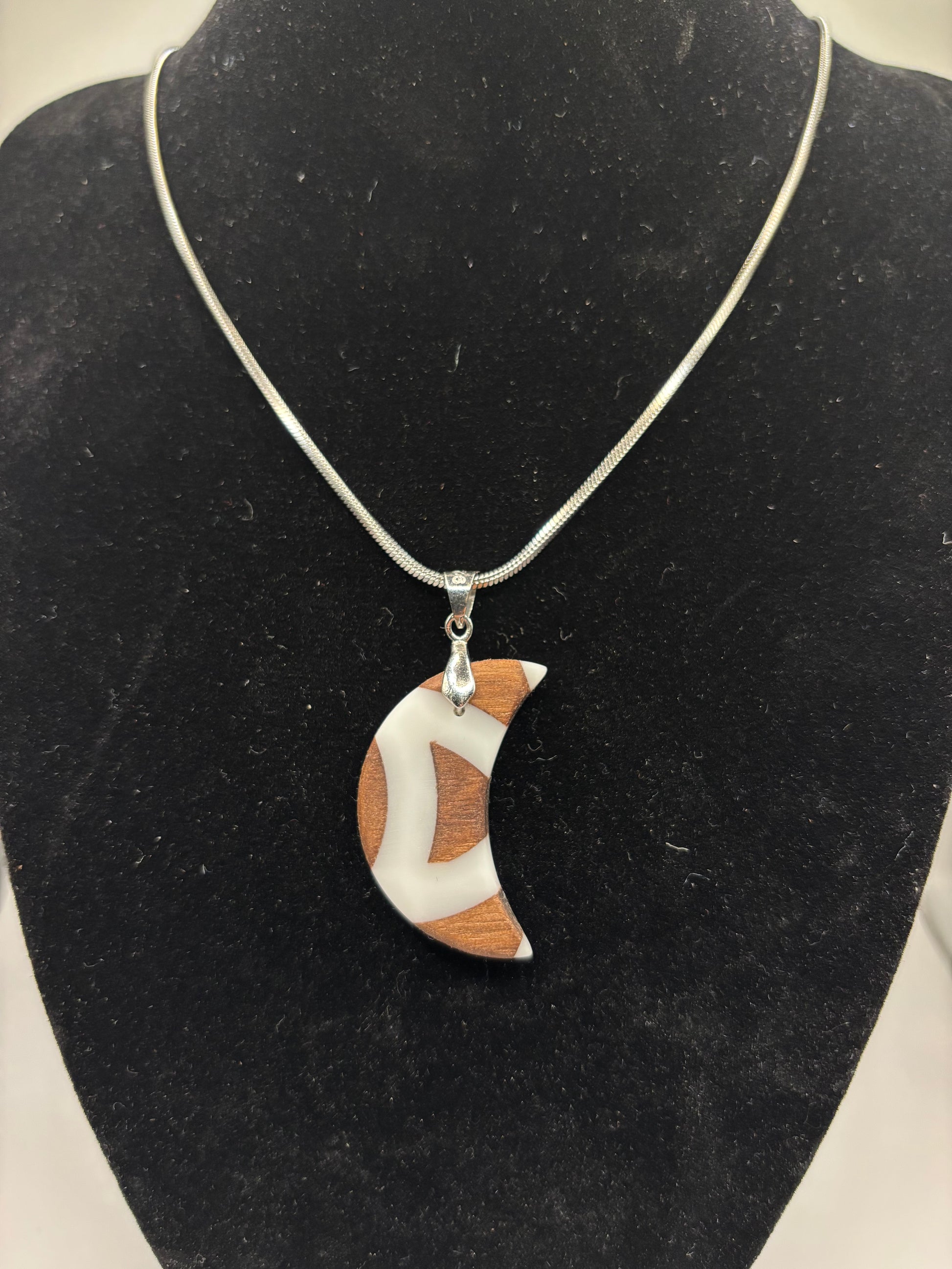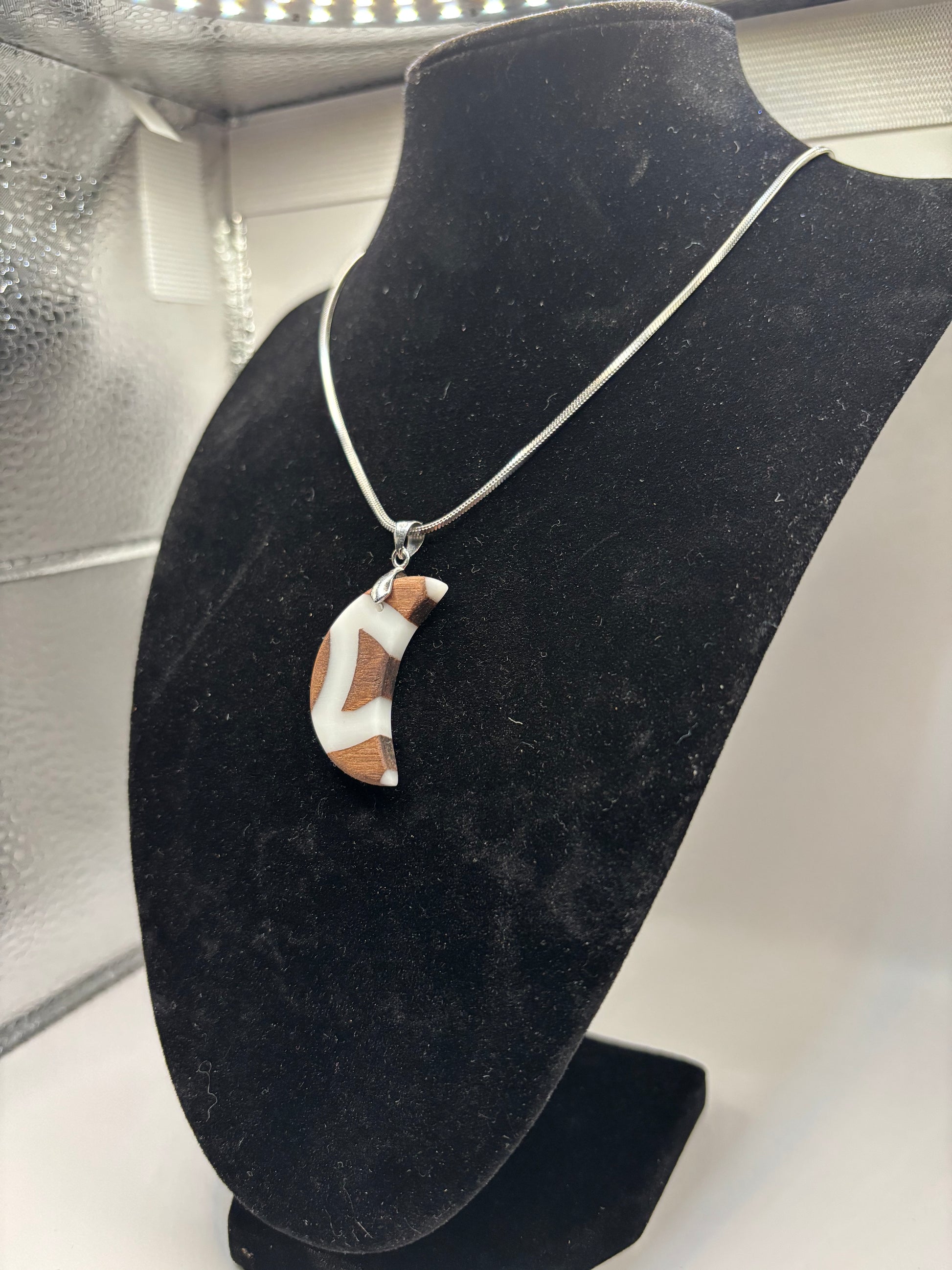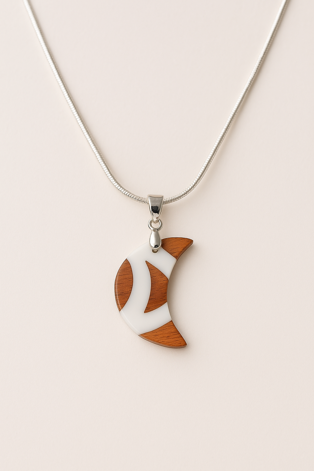 Ce pendentif unique associe la chaleur du bois naturel et la pureté de l’époxy blanc. Ses lignes organiques rappellent l’équilibre entre nature et modernité, pour un bijou élégant et intemporel.